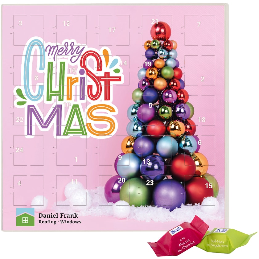 Calendario dell'Avvento quadrato con cioccolatini Ritter Sport. Questo calendario dell'Avvento contiene 24 cubetti di cioccolato Ritter Sport. L'inserto è compostabile e il 100% del processo produttivo avviene a zero impatto sull'ambiente.