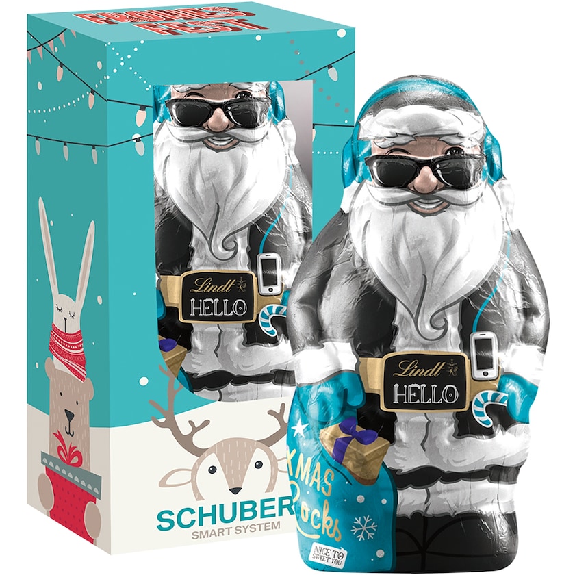 Babbo Natale di Cioccolato della collezione Lindt Hello. Questo Babbo Natale di cioccolato è prodotto con delizioso cioccolato al latte di altissima qualità. I Babbi Natale sono in colori assortiti, blu e rossi. L'intera confezione viene personalizzata secondo i tuoi desideri.