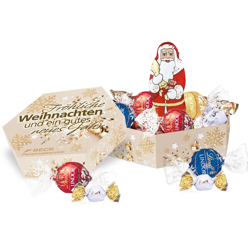 Scatola di pregiati cioccolatini Lindt. Lindt Christmas Maxi Box contiene 5 Lindt Lindor, 5 cioccolatini ripieni Lindt e 1 Babbo Natale di cioccolato Lindt. Il regalo di Natale perfetto per i clienti più importanti. L'intera confezione viene personalizzata secondo i tuoi desideri.