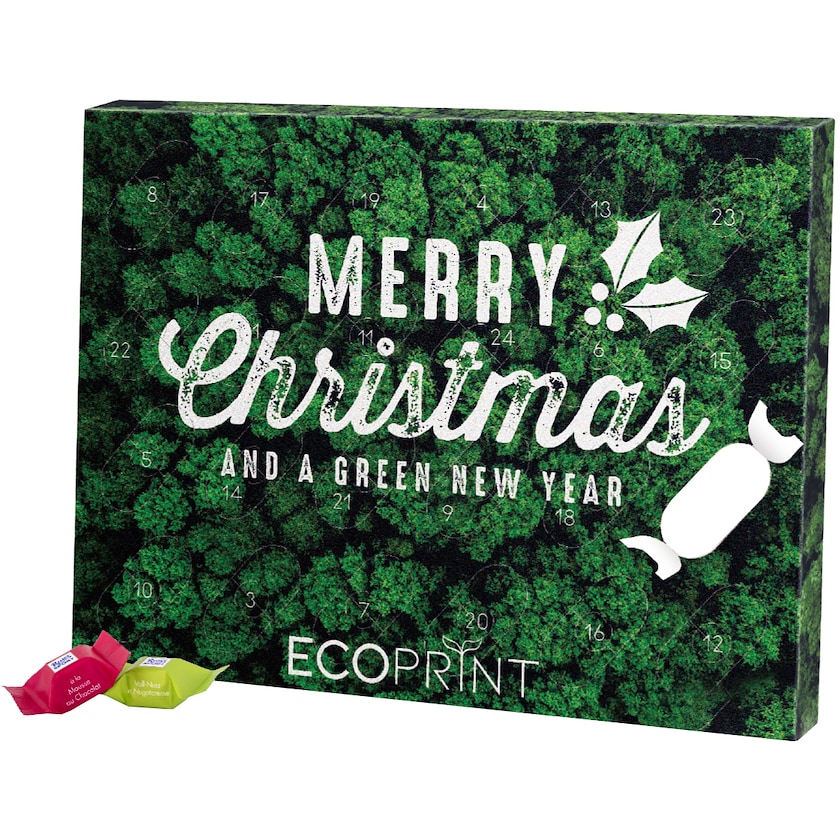 Calendario dell'Avvento ecologico con cioccolatini Ritter Sport. L'intero calendario dell'Avvento è realizzato in carta ed è quindi interamente compostabile così com'è. Questo calendario dell'Avvento è riempito con deliziosi cioccolatini Ritter Sport Chocolate Cube a gusti misti.