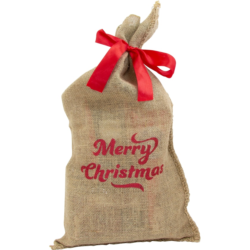 Grande sacco di juta con la stampa "Merry Christmas" in rosso. Il sacco contiene chips al cioccolato al latte, babbi natale gommosi, praline di marzapane, cioccolatini al caramello, caramello croccante, mandole allo zafferano, cioccolatini choco & plus e due tipo di tartufini al cioccolato.