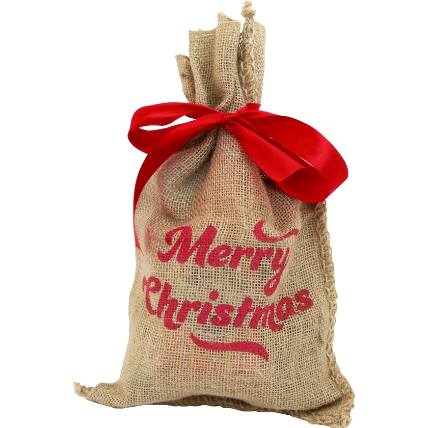 Piccolo sacco di juta con la stampa "Merry Christmas" in rosso. Contiene mandole allo zafferano, chip al cioccolato al latte, tartufini al cioccolato, praline di marzapane e babbi natale gommosi. Il sacco di juta è fornito di un fiocco rosso. Può essere completato con un biglietto d'auguri.