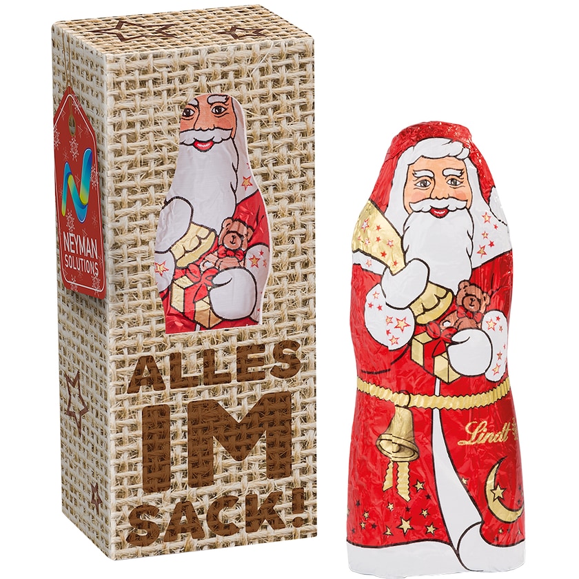 Babbo Natale Lindt da 10 g in scatola di cartoncino personalizzata. La scatola di cartoncino è interamente personalizzabile secondo i tuoi desideri. Scarica il modello di stampa e crea la tua confezione regalo personalizzata. Il Babbo Natale è realizzato in morbido e delizioso cioccolato al latte Lindt.