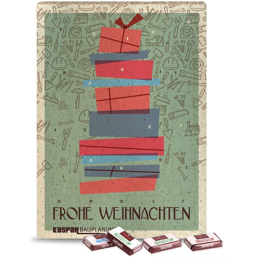 Calendario dell'Avvento certificato Fairtrade con cioccolatini Sarotti. Lo strato più esterno del calendario è realizzato in carta erba ecologica, mentre l'inserto è in cartoncino riciclato. I cioccolatini sono ai gusti misti Vollmilch, Gianduja, Haselnuss e Zartbitter. Questo calendario dell'Avvento è pensato per essere appeso a una parete.
