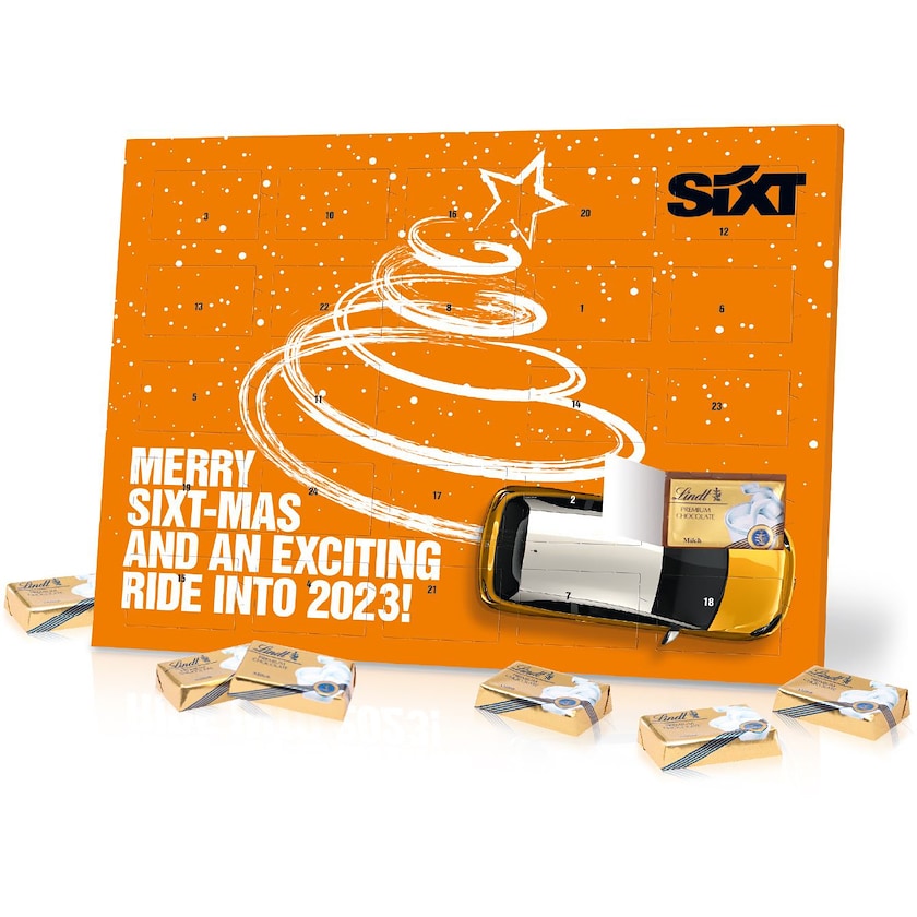 Calendario dell'Avvento ecologico con cioccolatini al latte Lindt. Il cartoncino è certificato FSC, mentre l'inserto è in materiale riciclato. Sul retro si trova un supporto che permette di tenere in piedi il calendario su un tavolo, ad esempio.