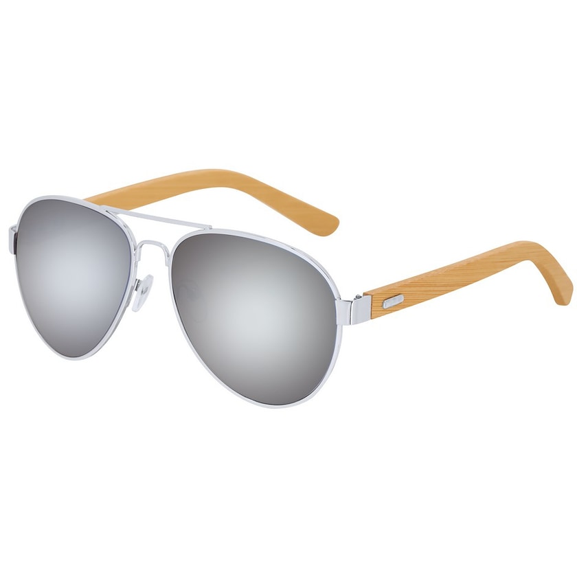 Occhiali da sole da pilota con lenti a specchio. Le lenti hanno protezione UV400. Le stanghette sono realizzate in bambù. Consegnato in una busta in microfibra.