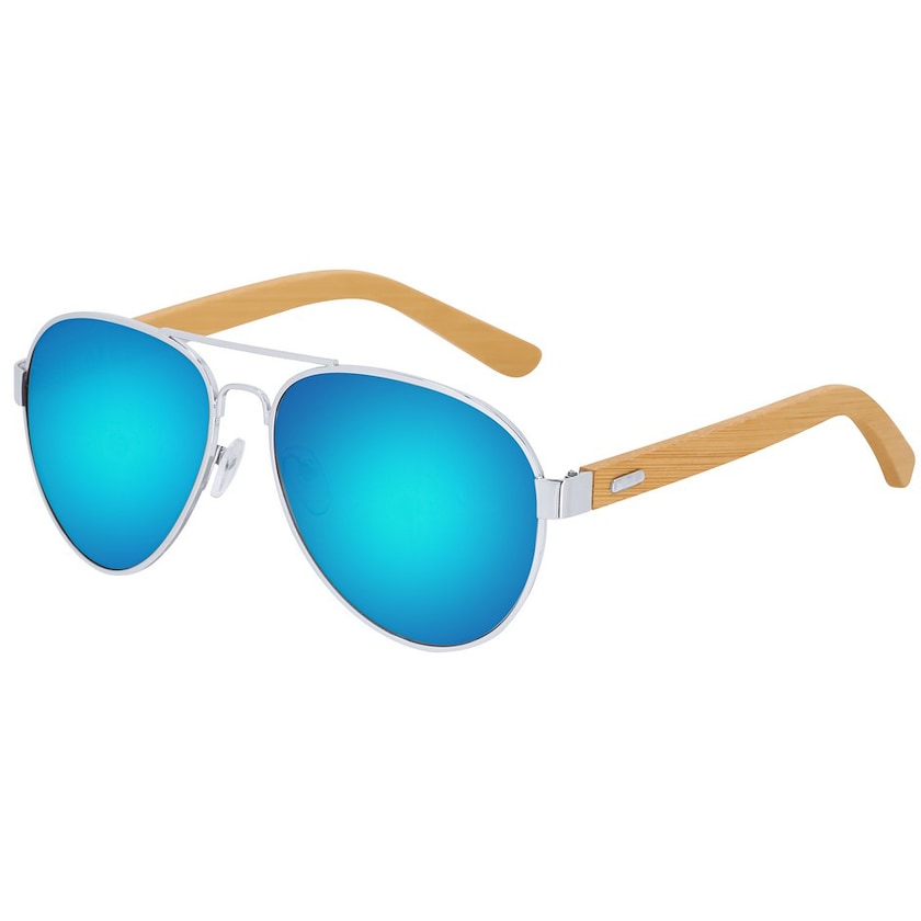 Occhiali da sole da pilota con lenti a specchio. Le lenti hanno protezione UV400. Le stanghette sono realizzate in bambù. Consegnato in una busta in microfibra.