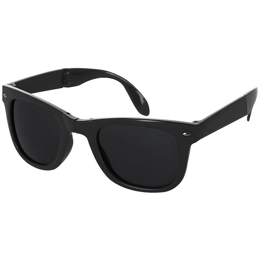 Occhiali da sole neri pieghevoli personalizzati. Le lenti hanno protezione UV400. Consegnati in una custodia con cerniera.