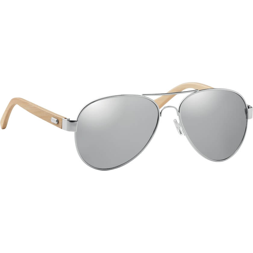 Occhiali da sole classici, modello pilota. Le asticelle degli occhiali sono realizzate in bambù, mentre le lenti sono disponibili in tanti colori diversi. Gli occhiali garantiscono una protezione UV400. Vengono consegnati in una custodia di microfibra abbinata al colore delle lenti. L'incisione a laser viene realizzata sulle asticelle, mentre la stampa sulla custodia.