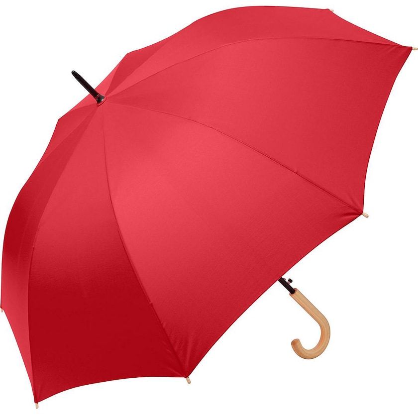 Ombrello da golf ecologico con tessuto in poliestere riciclato. L'ombrello ha dettagli in vero legno e plastica riciclata. Il manico è in legno. Il tessuto è colorato con un metodo ecologico che richiede meno acqua del solito.