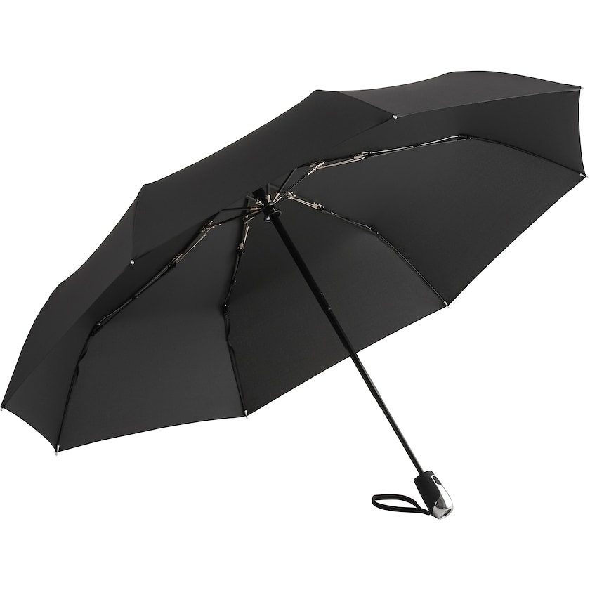 Ombrello pieghevole con apertura e chiusura automatiche. Questo ombrello è di altissima qualità e vanta un sistema antivento con stecche in fibra di vetro, mentre il tessuto è realizzato in plastica riciclata certificata secondo STANDARD 100 di OEKO-TEX®. Il manico vanta dettagli in metallo cromato.