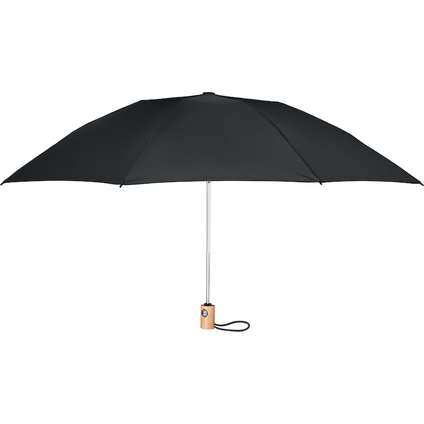 Ombrello pieghevole ecologico personalizzato. L'ombrello è realizzato in rPET, ossia in bottiglie di PET riciclate. Il manico è in bambù, mentre le stecche sono in fibra di vetro resistente. Sia l'aperta che la chiusura sono automatiche.