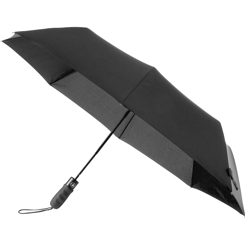 Pregiato ombrello pieghevole personalizzato. Questo ombrello è dotato di asta e stecche in metallo. Il manico è molto comodo da tenere in mano. Meccanismo automatico