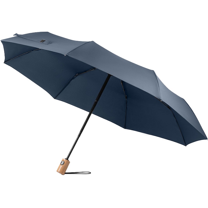 Ombrello pieghevole con stampa personalizzata. Il tessuto è realizzato in rPET, ossia in bottiglie di PET riciclate. Le stecche sono realizzate in fibra di vetro, mentre il manico è in legno. Si apre e si chiude automaticamente.