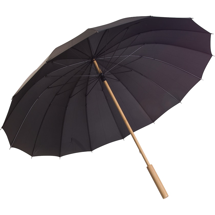 Ombrello antivento ecologico con dettagli in bambù. Il tessuto è realizzato in rPET, ovvero bottiglie PET riciclate. L'asta dell'ombrello e il manico sono in bambù e le stecche sono in fibra di vetro. L'ombrello è dotato di un'etichetta che mostra che il tessuto è realizzato in rPET.