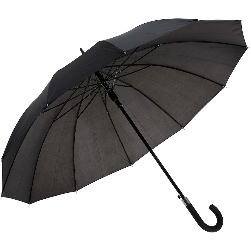 Ombrello nero tinta unita con dodici pannelli. L'ombrello è dotato di un manico gommato e di apertura automatica.