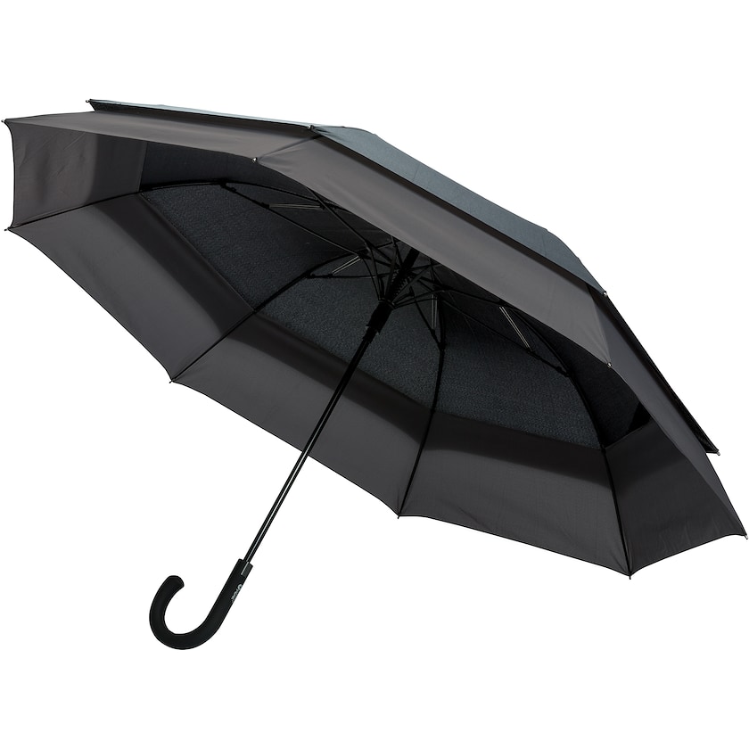 Ombrello antivento di alta qualità. Le stecche sono in fibre di vetro e l'asta dell'ombrello è in metallo. Il tessuto è in poliestere riciclato. Quando l'ombrello è chiuso è molto compatto. L'apertura è automatica e la chiusura è manuale.