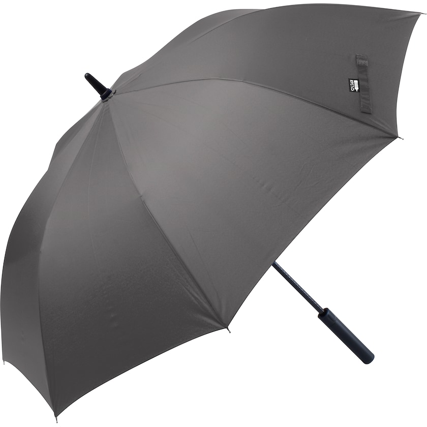 Ombrello antivento ecologico personalizzato. Il tessuto dell'ombrello è in rPET ecologico e l'asta e le stecche sono in fibra di vetro.