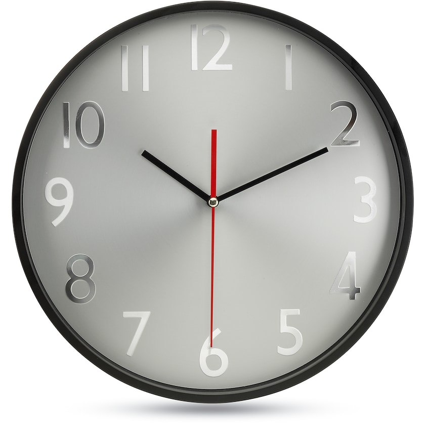 Orologio da muro con quadrante argentato e bordo nero. Le cifre sono in alluminio e il quadrante è di vetro. Funziona con 1 batteria AA (non inclusa). Stampa possibile solo ad 1 colore.