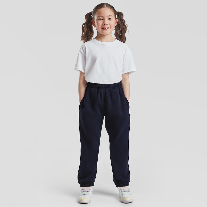 Pantaloni della tuta Fruit of the Loom in tessuto resistente. Prodotti con un tessuto misto di poliestere leggermente più resistente del normale. Questi pantaloni non hanno il laccetto in vita per minimizzare il rischio di soffocamento. Confezionati singolarmente in busta di plastica. Disponibile anche in modello da adulto.