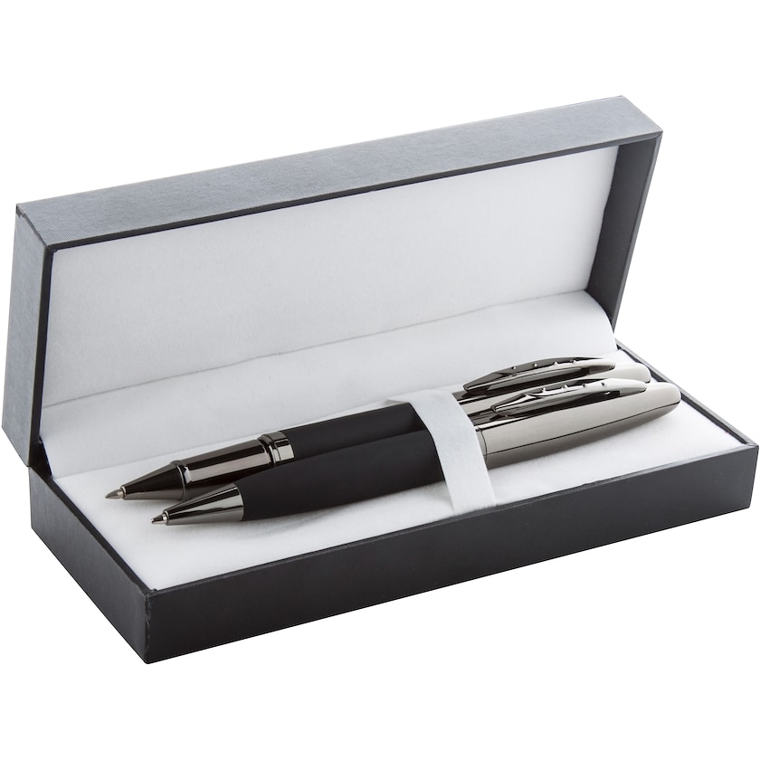Moderno set di penne con penna a sfera e un roller. Penne in metallo con impugnatura di gomma e con superficie in metallo in colore gunmetal. Con inchiostro blu. Personalizzabile con stampa oppure con incisione laser. Il costo della personalizzazione si intende per la personalizzazione di una delle penne.