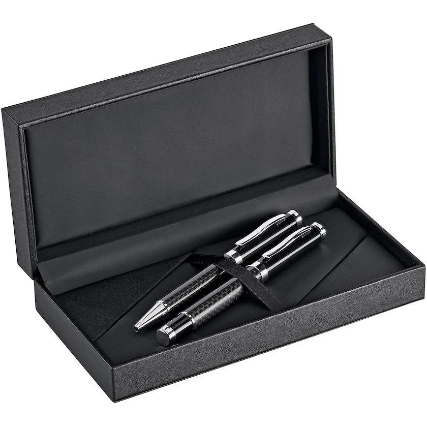 Set esclusivo con due penne in metallo e fibra di carbonio. Il set contiene una penna a sfera e una stilografica. La penna a sfera è dotata di meccanismo a rotazione. Le penne contengono inchiostro nero. Il prezzo di personalizzazione si riferisce a solo una delle due penne.