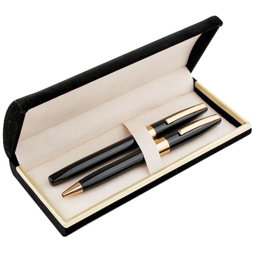Elegante set di penne con penne in metallo e dettagli cromati oro. In questo set troviamo una penna a sfera e una penna roller. Il prezzo dell'incisione laser comprende l'incisione su entrambe le penne.