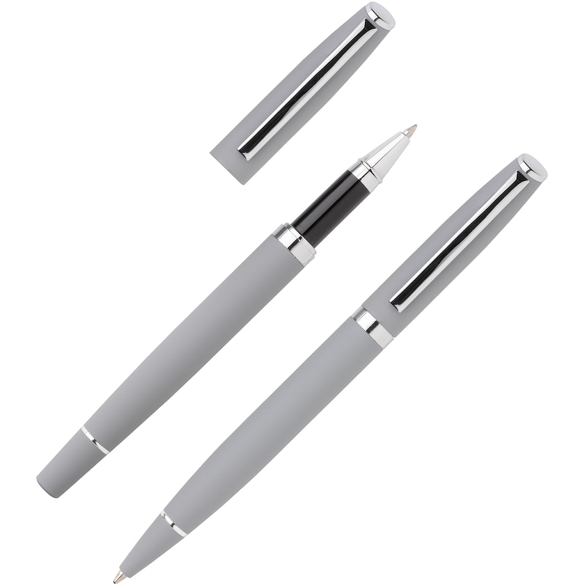 Elegante set di penne con superficie opacizzata. Il set contiene una penna a sfera e una penna stilografica. L'impugnatura delle penne è molto confortevole grazie alla loro superficie opacizzata.