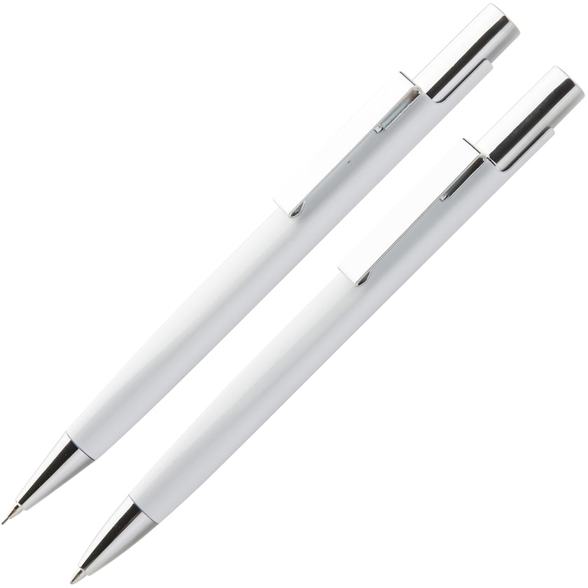 Set con penna a sfera e portamine in scatola regalo nera. Le penne sono realizzate in alluminio. La penna a sfera ha l'inchiostro nero e il portamine è dotato di una mina da 0,7 mm. Il logo viene applicato con stampa ad 1 colore oppure con incisione laser. Il prezzo per l'applicazione del logo si riferisce una delle due penne.