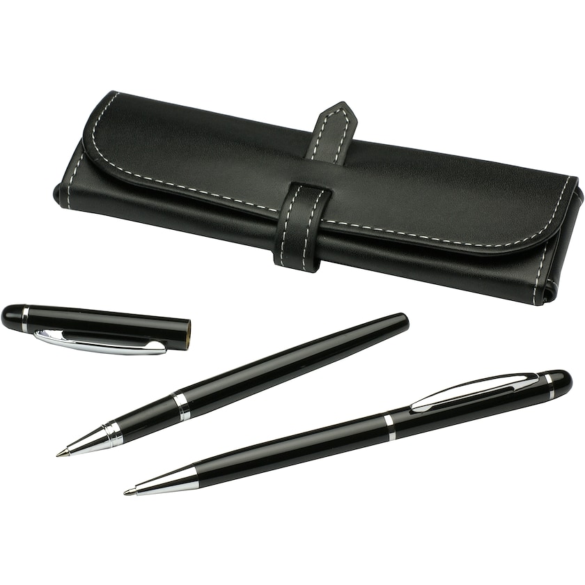 Parure di penne uniche, in custodia di pelle sintetica. Con penna roller e penna a sfera di metallo. Le penne vengono personalizzate con incisione laser e la scatola regalo può essere stampata. Il prezzo di incisione prevede l'incisione solo su una delle due penne.