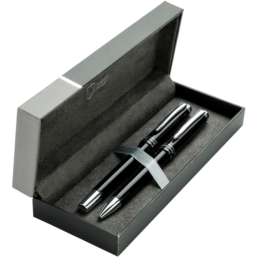 Set di lusso con penna a sfera e penna roller. Le penne hanno delle cartuccio d'inchiostro tedesche che scrivono per 1200 metri. Viene consegnato in una bella confezione regalo. Il prezzo della stampa si riferisce alla personalizzazione di una delle penne.