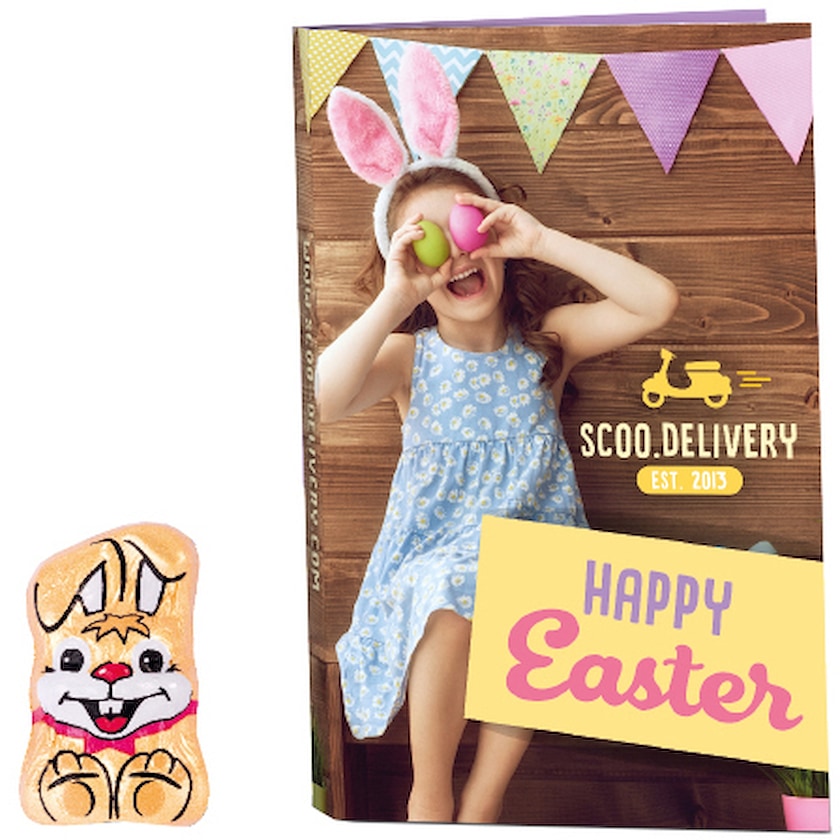 Cartolina con un coniglietto pasquale di cioccolato attaccato all'interno. La carta è stampata digitalmente secondo i vostri desideri. Qui c'è molto spazio per un messaggio pubblicitario potente!