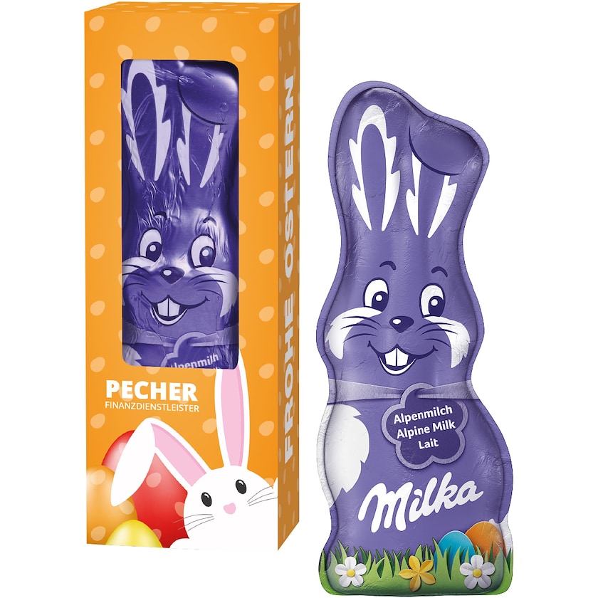 Coniglio di cioccolato Milka in confezione con stampa personalizzata. Questo coniglio di cioccolato è prodotto con il miglior cioccolato al latte. La confezione è realizzata in cartoncino certificato FSC e la sua produzione è a emissioni zero.