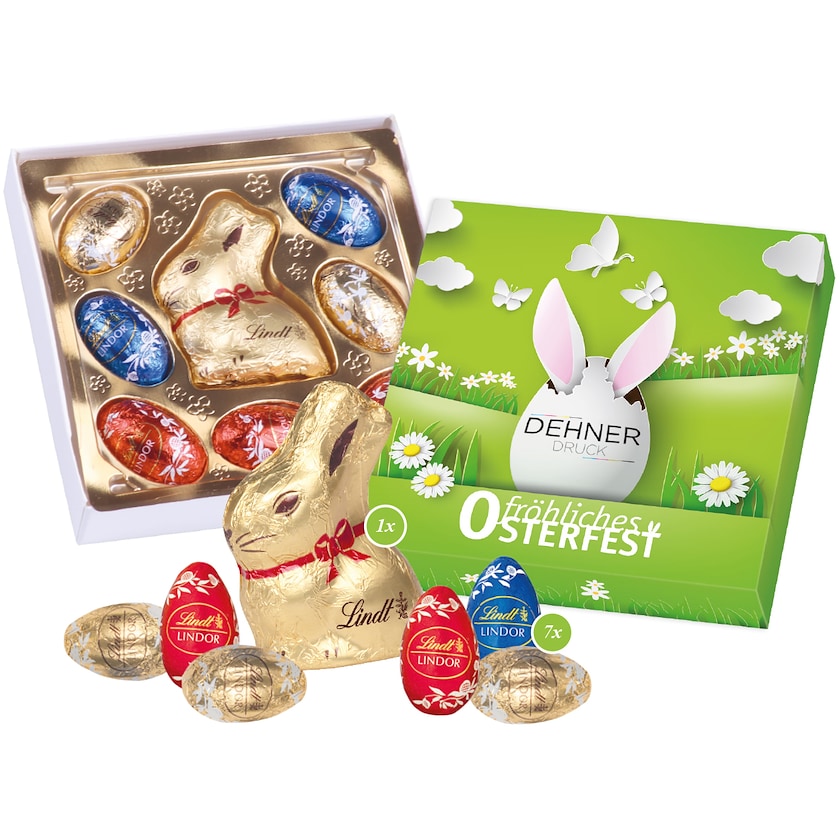 Scatola di cioccolatini pasquali di marca Lindt. Sorprendi i tuoi clienti! Questa scatola di cioccolati è prodotta a emissioni zero, è realizzata in carta certificata FSC e contiene 42 grammi di cioccolato di prima qualità.