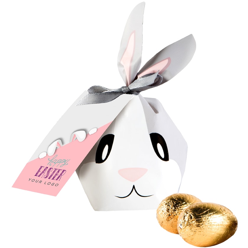 Confezione a forma di coniglio riempito con 5 uova di cioccolato. Le uova di cioccolato sono avvolte in fogli dorati e pesano complessivamente 50 grammi. La confezione è fornita con una carta di cartone, la cui parte frontale è stampata come desiderato.
