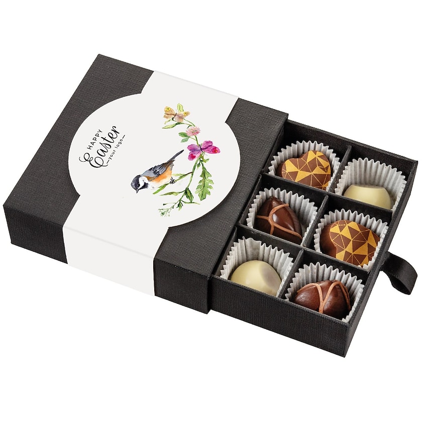 Lussuosa scatola con 9 cioccolatini. I cioccolatini sono di altissima qualità e pesano 63 grammi in totale. La scelta migliore per chi cerca una scatola di cioccolatini come delizioso regalo di Pasqua. La stampa viene realizzata sul cartoncino che avvolge la scatola.