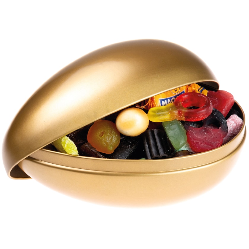 Uovo di Pasqua in metallo riempito con cioccolatini e caramelle misti. Un uovo di Pasqua moderno per un'azienda moderna!