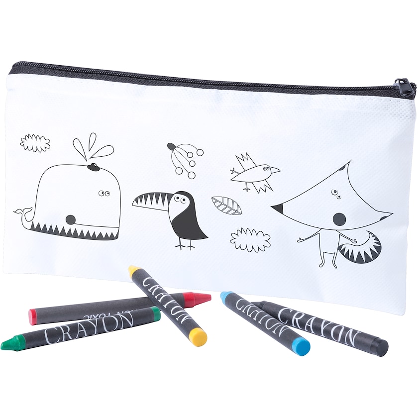 Il set contiene pastelli a cera e un astuccio. L'astuccio ha un motivo prestampato da colorare.