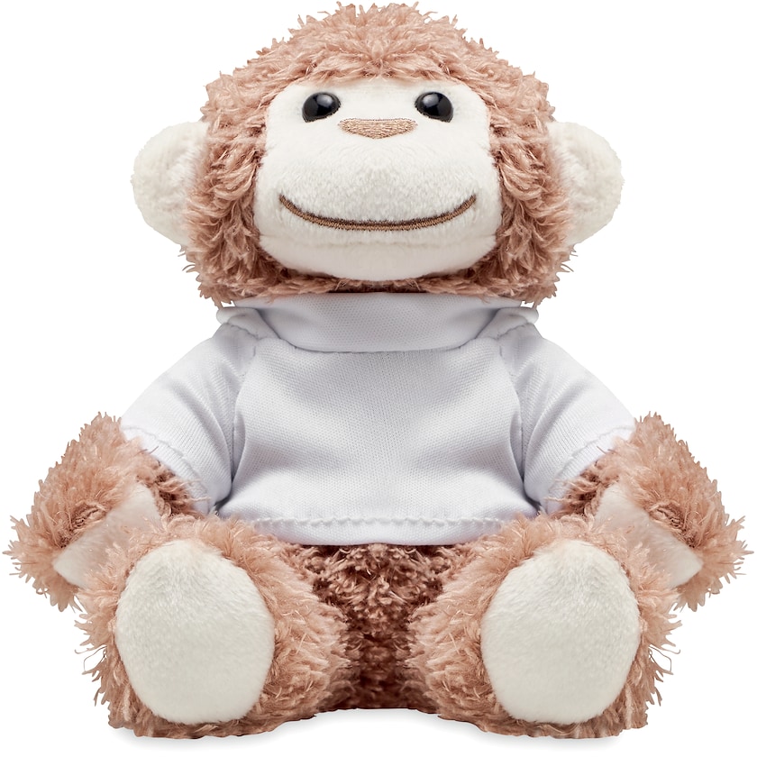 Una scimmia allegra e coccolona con felpa bianca. La stampa viene realizzata sulla felpa.