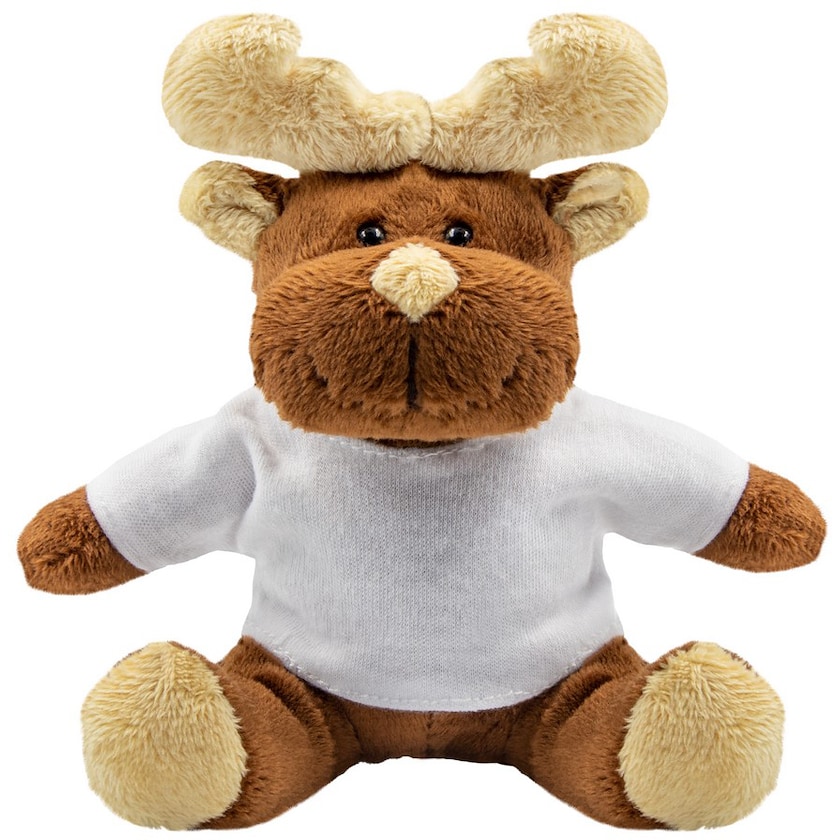 Dolce renna con maglietta bianca. Personalizzabile con logo sulla maglietta. Maglietta confezionata separatamente. Un peluche perfetto per il Natale!