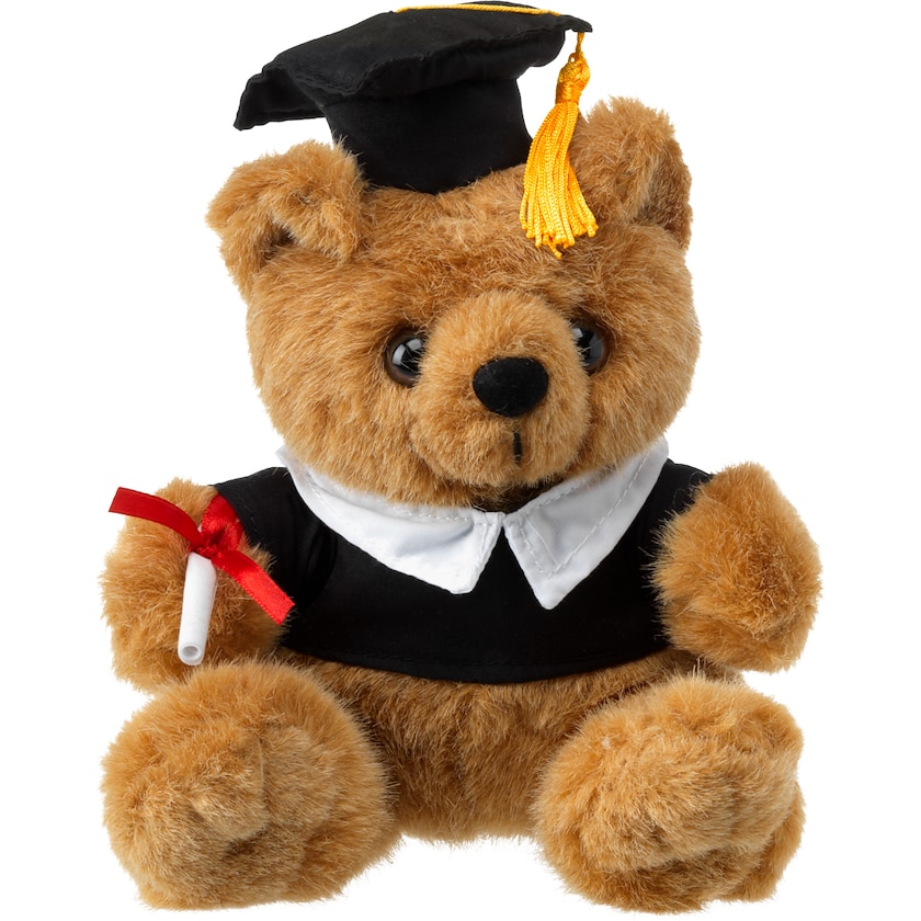 Orsetto con toga di laurea. L'orsetto tiene in mano una pergamena di laurea. È solo possibile la stampa a un colore.