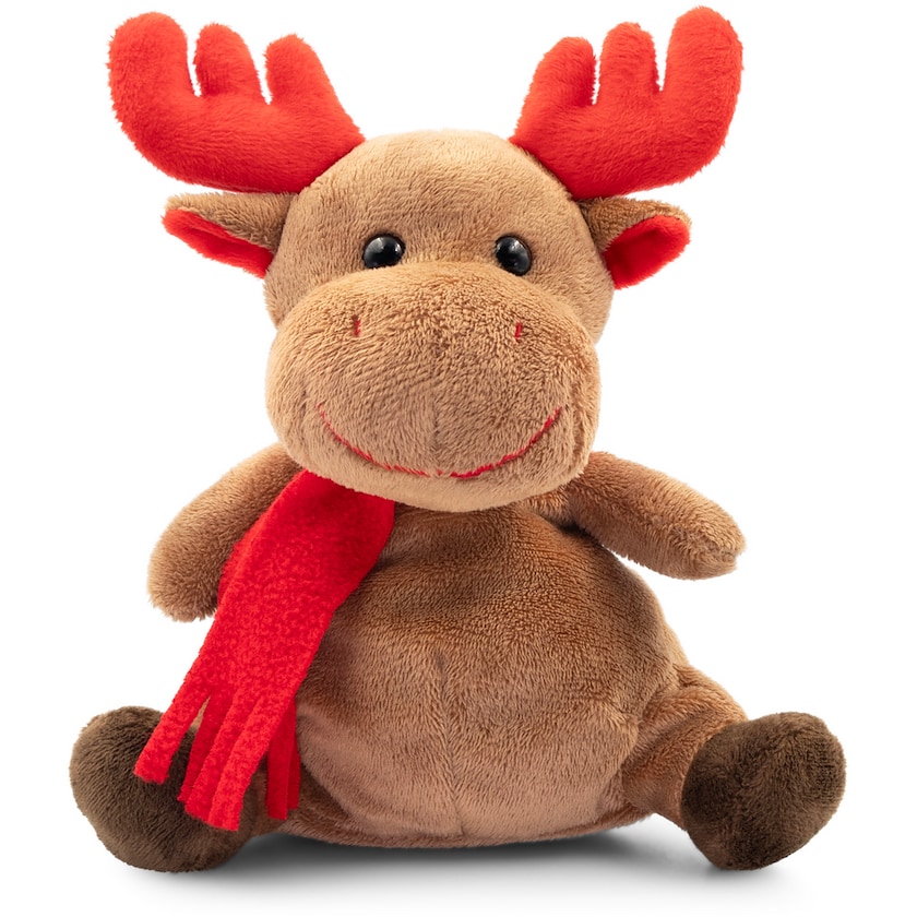 Dolce renna con sciarpa rossa. Grazie a delle sfere interne la renna può facilmente restare seduta.