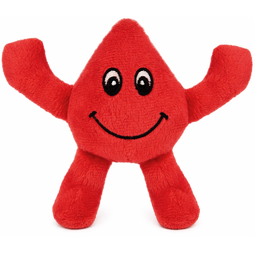 Peluche a forma di goccia di sangue. Gli occhi e la bocca sono ricamati. La stampa è realizzata sul retro del peluche.