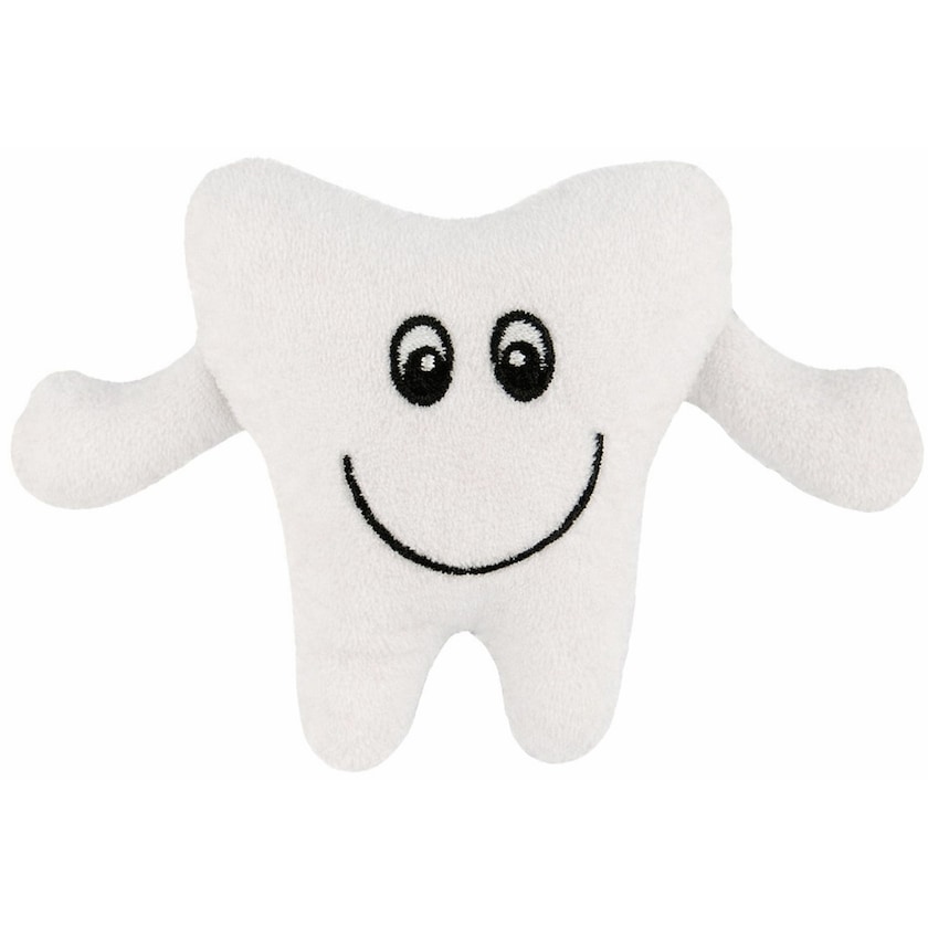 Peluche a forma di dente. Gli occhi e la bocca sono ricamati. La tua stampa è realizzata sul retro del peluche.