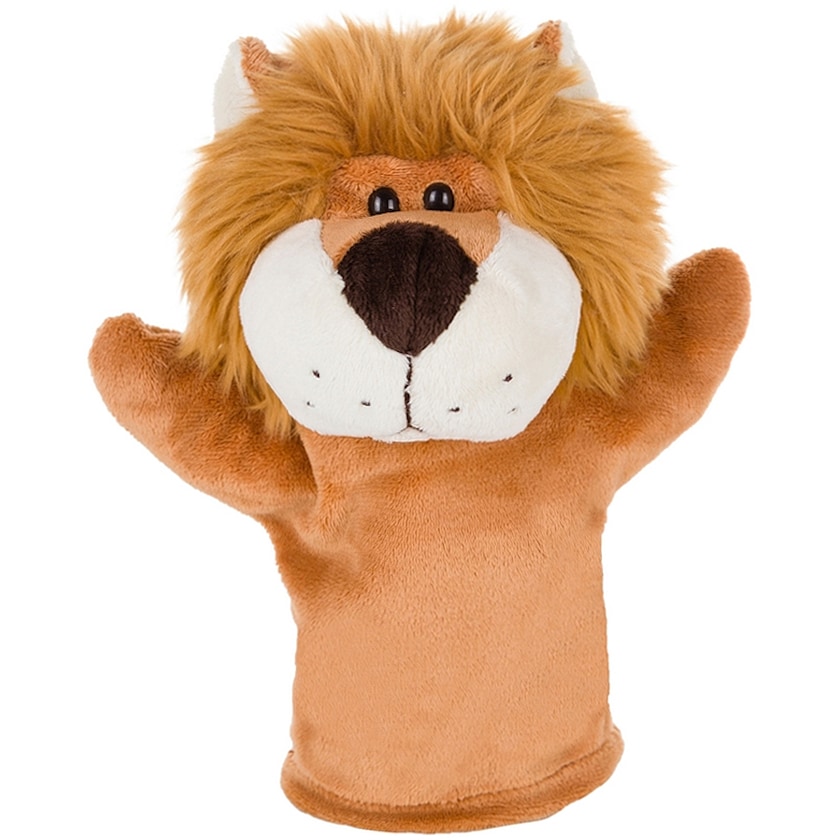 Burattino a forma di leone. La stampa viene realizzata sul petto del leone. Ecco un regalo divertente e creativo per bambini.