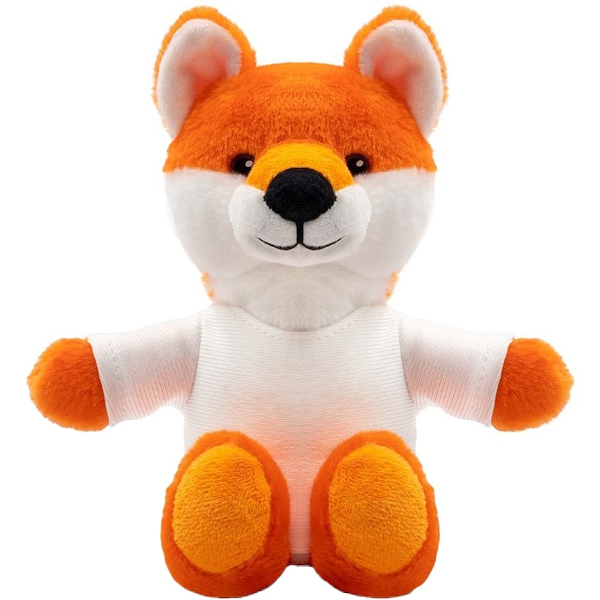 Tenera volpe in materiale ecologico. Todd è realizzata in rPET, ossia in bottiglie di PET riciclate, ed è certificata GRS. La stampa viene realizzata sulla maglietta (consegnata separatamente dal peluche).