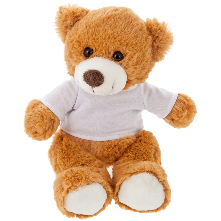 Orsetto contento con maglietta bianca. La personalizzazione viene effettuata sulla maglietta che verrà fornita seperatamente. Un orsacchiotto felice che diffonde gioia!