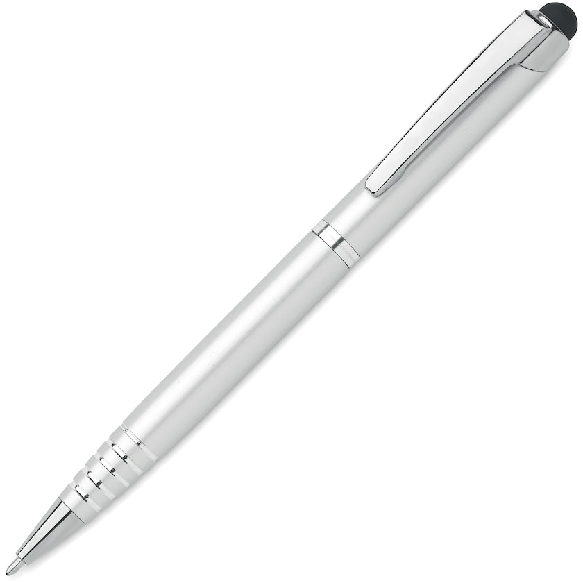 Pregiata penna touch in alluminio riciclato. La penna ha meccanismo di rotazione e inchiostro blu. Scegli tra stampa o incisione a laser.