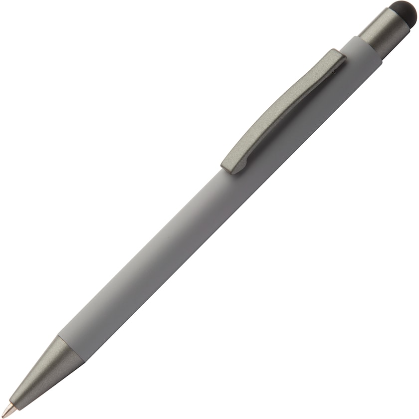 Penna touch in alluminio con superficie gommata. Grazie alla superficie gommata la penna è comoda per scrivere. La personalizzazione viene realizzata con incisione a laser.