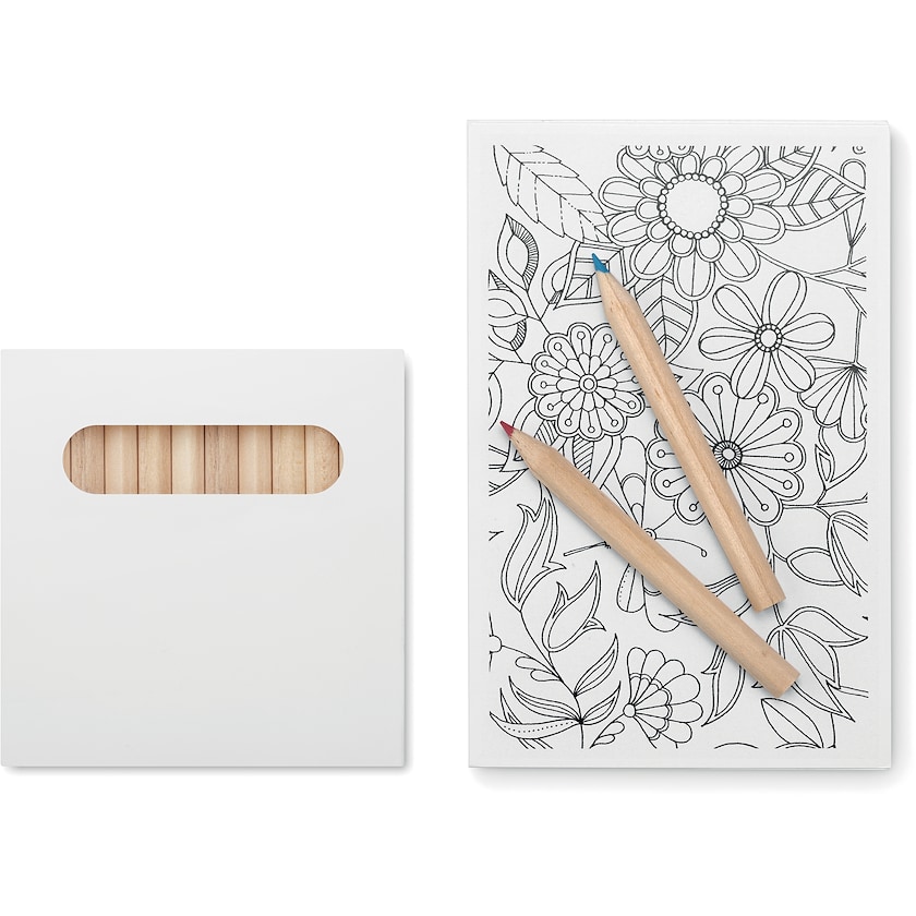 Set di pastelli colorati con fogli da scarabocchiare. Il set è indirizzato ad un pubblico maturo per il relax nel tempo libero. Il set contiene 10 fogli e 12 pastelli colorati. La personalizzazione viene effettuata sulla copertina.